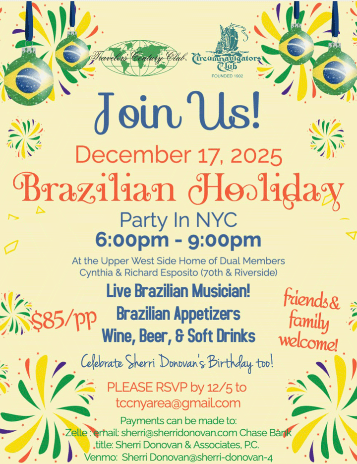 The New York TCC Chapter invites members to join us for our Brazilian Holiday Party on Dec. 17 from 6 to 9 p.m. at the Upper West Side home of dual members Cynthia and Richard Esposito (70th and Riverside). The gathering will feature live Brazilian music, Brazilian appetizers, plus wine, beer and soft drinks. We will also be celebrating Sherri Donovan‘s birthday. Friends and family welcome!